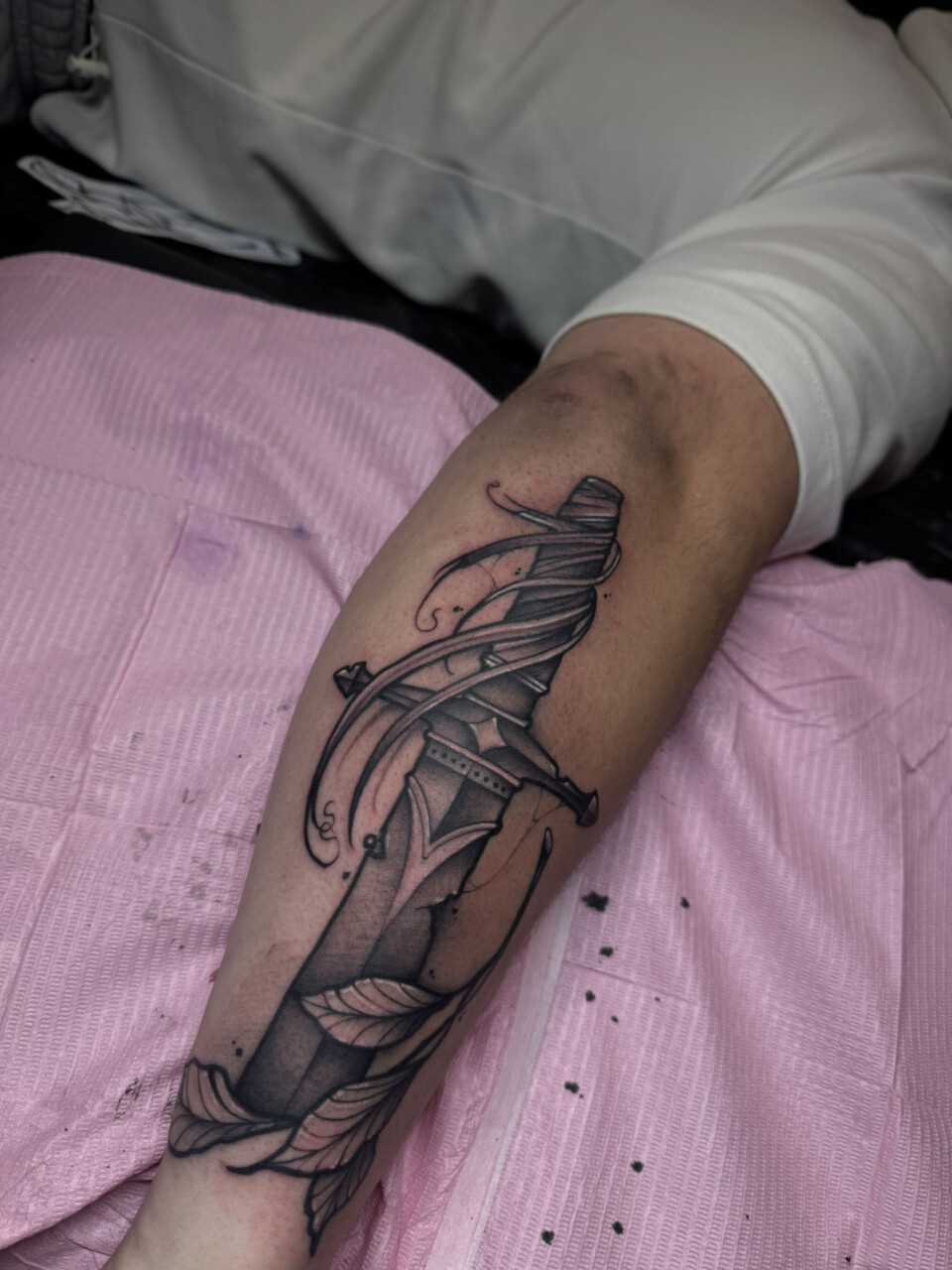 • Großes Black n Grey Realismus Graffiti Tattoo am Oberschenkel, Negativ Schrift